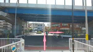 ②西口階段を降りたら道なりに緩やかな右カーブ。